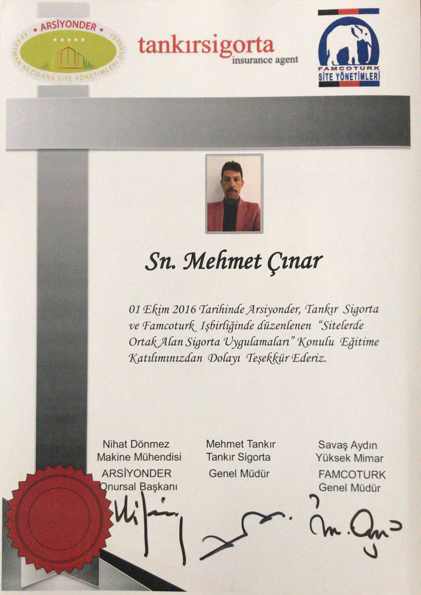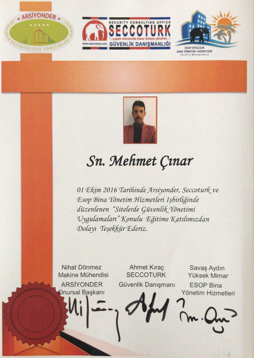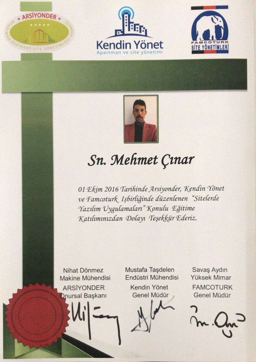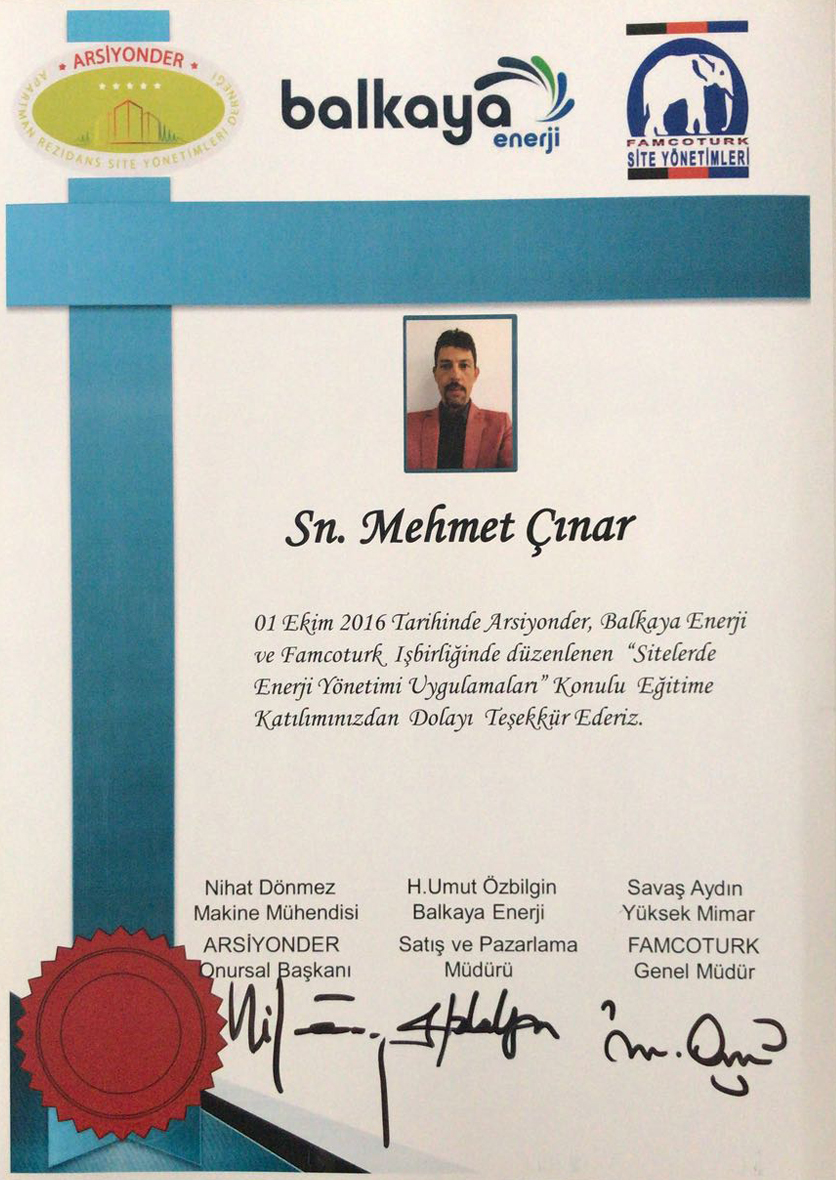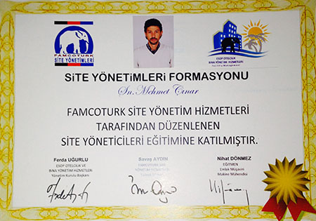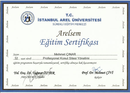 Siz değerli müşterilerimize en kaliteli hizmet vermeyi amaçlayan firmamız İstanbul Arelsem Üniversite'si profesyonel konut ve site yönetimi 2014 yılı 11. Dönem lisans eğitimi alarak tamamlamıştır.